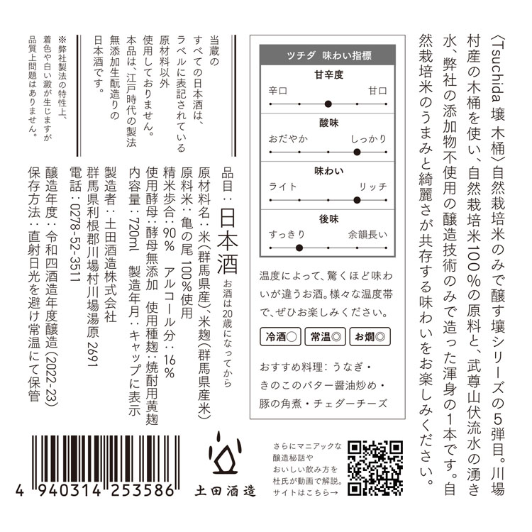 Tsuchida 壌木桶は、自然栽培米の群馬県産亀の尾を使用し、酵母無添加の生酛製法で添加物を一切加えず、川場村杉材の木桶で造られたお酒です。