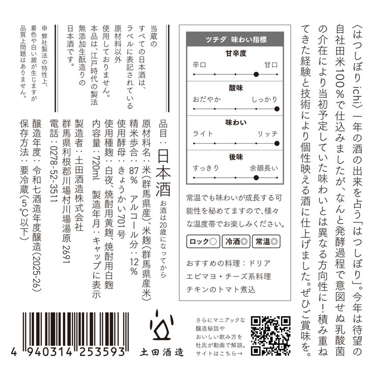 この偶発的な味わいは、土田酒造の酒造りの厳しさと、自然の奇跡的な産物であり、今年だけの特別な一品です。杜氏の星野元希は技術的な未熟さを反省していますが、自然の恵みを受け入れ、新たな挑戦として今後も酒造りに励んでまいります。